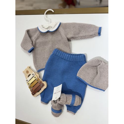 Completino spezzato tortora con colletto bianco e bordini con blu elettrico, pantaloni blu elettrico, cappello e babbucce tortora e blu elettrico. 100% lana merino.