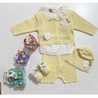 Tutina bianca con colletto tortora/blu e bianca in filo di cotone con orsetto al centro, cappellino bianco con bordo tortora e blu, babbucce tortora coordinata.
