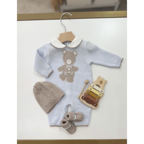 Tutina azzurra con orsetto al centro tortora, bordino della tutina delle maniche e piedino tortora. Cappellino tortora e babbucce coordinate. Prodotto artigianale di alta qualità.