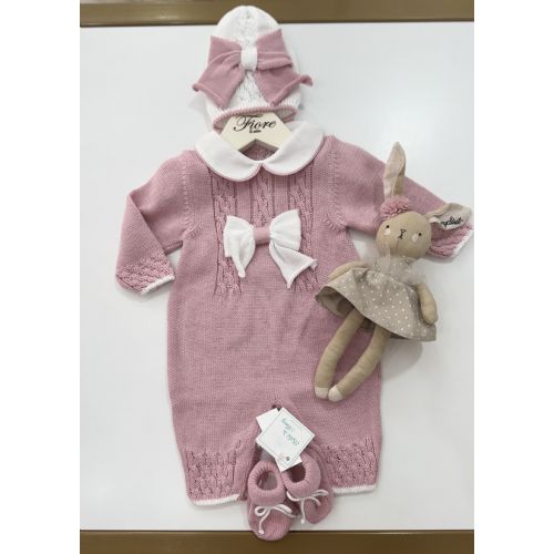 Tutina malva elaborata a trecce con collo bianco e fiocco al centro e bodino nella maniche e gambe bianco, cappello bianco con fiocco malva, babbucce malva. Prodotto artigianale. 100 % cotone .