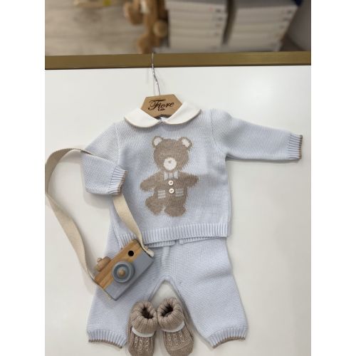 Completino 2 pezzi cielo e tortora con orsetto al centro. 100% cotone.