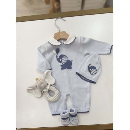 Tutina in filo di cotone cielo e blu tenue, con elegante al centro con due palloncini in 3D, cappello con elefante e babbucce coordinate. 100% cotone. Prodotto di alta qualità artigianale.