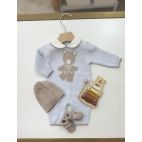 Completino in filo di cotone cielo con orsetto in tessuto e mongolfiera e babbucce coordinate. 100% cotone. Made in Italy.