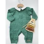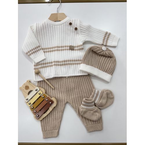 Completino in filo di cotone bianco e sabbia elaborato a costine con cappellino e babbucce coordinate. 100% cotone. Made in Italy.