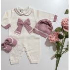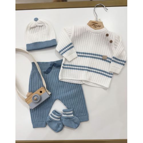 Completino in filo di colore bianco e carta da zucchero. Cappello e babbucce coordinate.