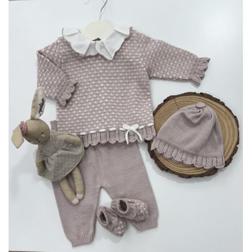 completino con collo in lino a nuvole, cappellino e babbucce coordinate. Colore: Marsala/bianco. Prodotto artigianale. 100% cotone. Made in Italy.