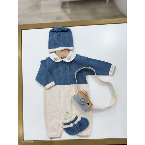 Tutina in filo di cotone colletto bianco in lino con osetti, cappellino e babbucce coordinati.
