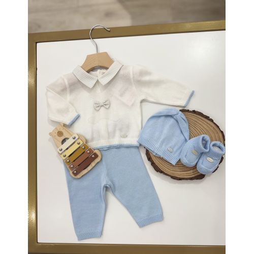 Completino Spezzato, maglia bianca manica lunga con orsetto con papillon, colletto a righe cielo e beige, bordino sia delle manica e vita cielo, pantalone cielo, cappello e babbucce. 100% cotone.