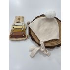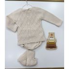 Completo 4 pezzi: maglia manica lunghe, cuolotta, babbucce e cuffia con piccolo pom pom. Colore: Natural.