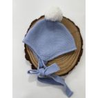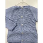 Comoletino 4 pezzi: maglia maniche lunghe, cuolotta, babbucce e cuffia. Colore: cielo. 60% lana 40% acrylic. Made in Spagna.