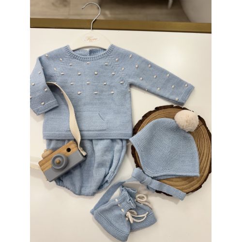 Completino 4 pezzi: Maglia maniche lunghe, cuolotta, babbucce e cuffia. Colore: Nube. 60% lana 40% acrylic.