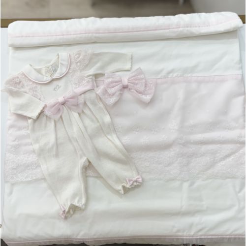 Brand: Minù . Uscita clinica romantica. Tutina bianca in filo di cotone con pizzo Rosa e fiocco al centro coordinata con la sua coperta sfoderabile.