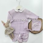 Completino spezzato con maglia bianca e colletto tortora con righa blu/bianca e orsetto centrale, pantalone lungo tortora, cappellino e babbucce coordinate. 100% cotone.