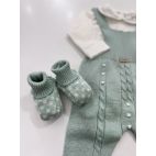Brand: Marlú. Set nascita con salopette verde con trecce e punto smock e body con la scritta amore sul collo manica lunghe, cappello e babbucce coordinate. Colore: Verde salvia/ Vaniglia. 100% cotone. Made in Italy.