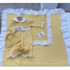Brand: Pappa & Latte. Coordinato nascita con pizzo sangallo. Comprende: Tutina in filo di cotone, cappellino e babbucce. Colore: Giallo/Bianco. 100% cotone. Made in Italy.