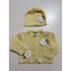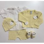 Brand: Marlú. Tema: Margherite Completino corto con camicia plumetis, cardigan, cappellino e babbucce coordinate. Colore: Bianco/Giallo. 100% cotone. Made in Italy.