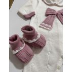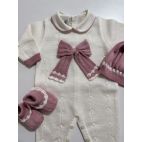Brand: Marlú. Uscita clinica con fiocco al centro. Tutina con fiocco, cappellino e babbucce. Colore:Vaniglia/Melograno. 100% cotone. Made in Italy.