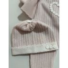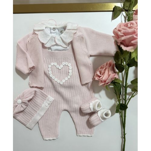 Brand: Marlú. Set nascita 5 pezzi. Salopette con fiorellini che formano un cuore al centro, body maniche lunghe con cardigan, cappellino e babbucce coordinate. Colore: Rosa cipria/bianco. 100% Cotone. Made in Italy.