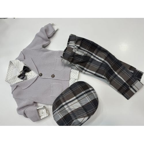 Completo elegante compreso di camicia di cotone a fantasia, pantalone modello sigaretta in tartan dai toni grigi e marrone caldo, cardigan con collo a giacca in grigio tortora, cappello e papillon in coordinato