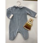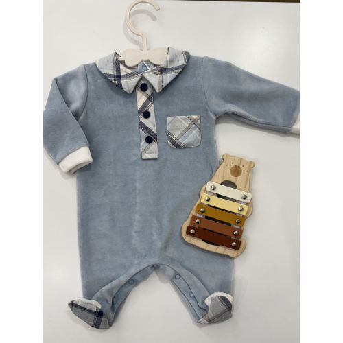 Tutina in ciniglia polvere con collo e tre bottoni blu in velluto, piedini a quadrettoni con blu/ polvere e panna, bordino sul pulsino panna. Made in Italy.
