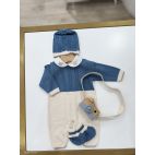 Tutina cielo con colletto piccoli righe in tessuto, orsetto al centro con un piccolo papillon. Filo di cotone. 100% cotone. Made in Italy.