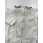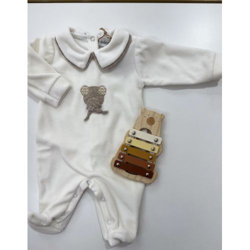 Tutina in ciniglia con orsetto al centro con piccolo fiocchetto e bordino del collo tortora. Unisex