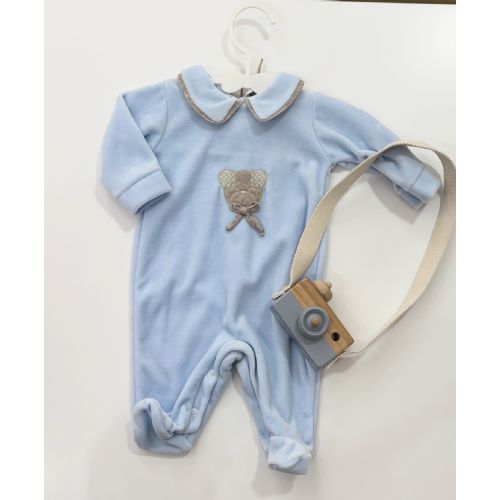 Tutina azzurra in ciniglia con orsetto al centro e piccolo fiocchetto, collo con bordino tortora. Made in Italy.