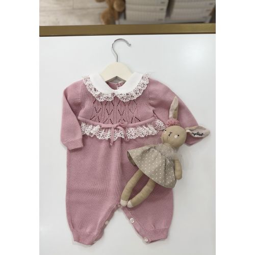 Tutina malva in filo di cotone con colletto bianco e merletto tutina con elaborazione traforata sul petto e merletto con un piccolo fiocchetto al centro. 100% cotone.