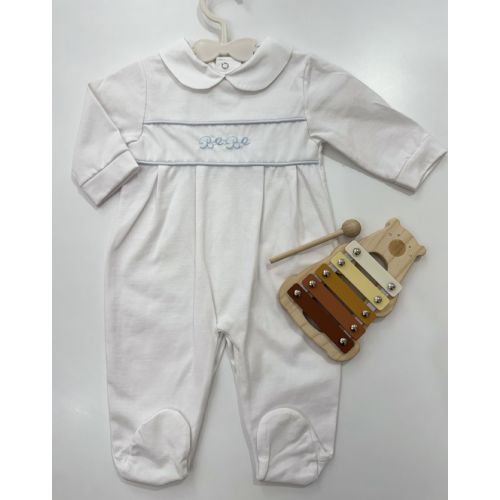 Brand: Jogus fashion. Tutina bianca in cotone con la scritta bebe al centro azzurra. 100% cotone.