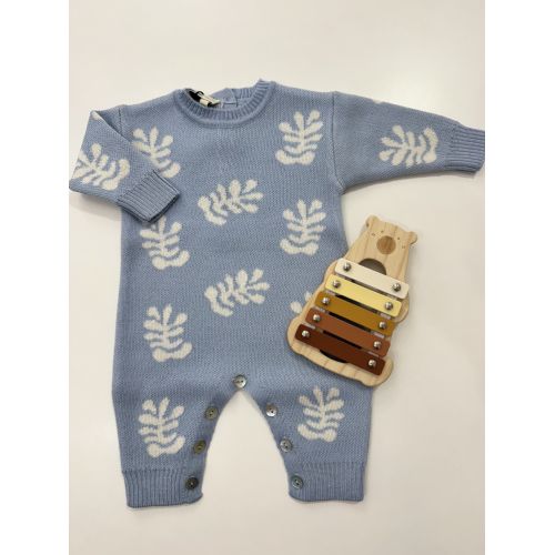 Brand: Maglificio di Verona. Tutina azzurra con foglie panna in lana con bottone sul retro e sulle gambe in madre perla. Prodotto artigianale. 100% lana merino. Made in Italy.