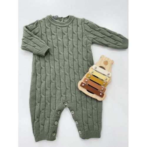Tutina Verde oliva in lana con trecce, bottoni sul retro e sulle gambe in madre perla.