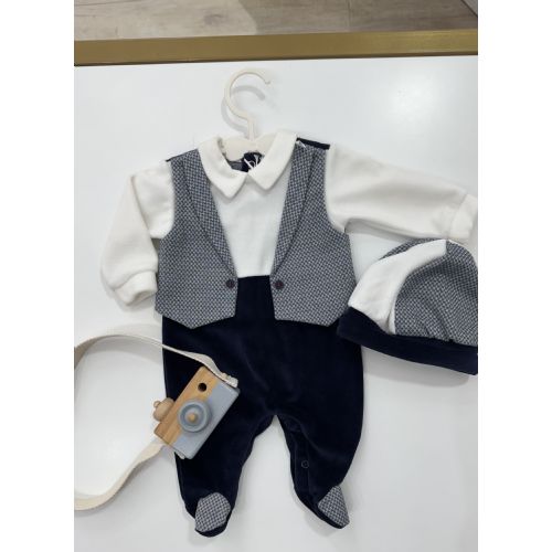 Tutina blu e panna in ciniglia con finto gilet e cappello coordinato. Made in Italy.