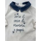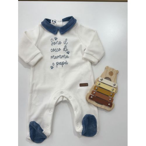 Brand: Minibanda. Tutina in ciniglia bianca con collo avion e scritta al centro sono il cocco di mamma e papà. 80% cotone 20% Poliestere. Made in Italy.