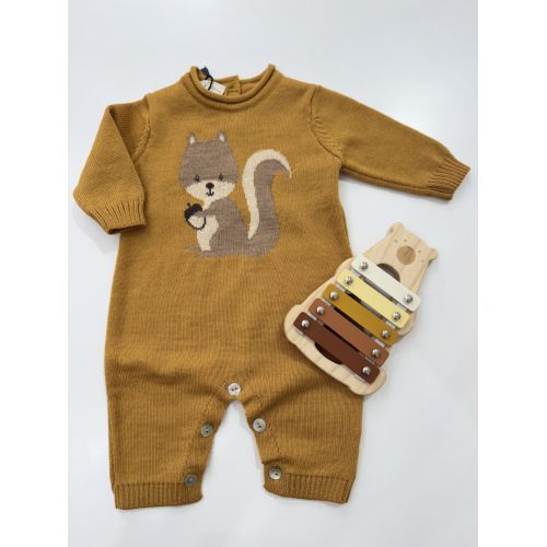 Brand: Maglificio di Verona. Tutina in lana senape con scoiattolo al centro, bottoni sul retro e sulle gambette con bottoni in madre perla. Prodotto artigianale. 100% lana merino.
