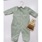 Tutina in cotone verde con trattore ricamato al centro colletto bianco.