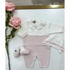 Comprende: Tutina elaborata sul petto con fiocco al centro bianco, cappello e babbucce coordinate, scialle bello elaborato con fiocco al centro e bordo bianco.