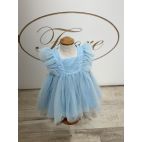Abito per bambina Sarabanda realizzato in canvas a righe con apertura dietro con zip invisibile. Tulle nel sottogonna. Cintura in vita in gros grain. Lunghezza al ginocchio.