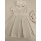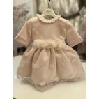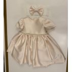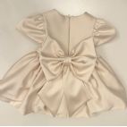 Abito in raso panna dorato con la manichetta ad aletta punto vita con punti luce e micro piumette, gonna a ruota, sul retro la chiusura lampo e un grosso fiocchettone tono su tono smontabile.