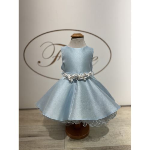 ideale per primo compleanno. Tessuto in raso un po' brillantinato. Colore: cielo. Made in Italy.