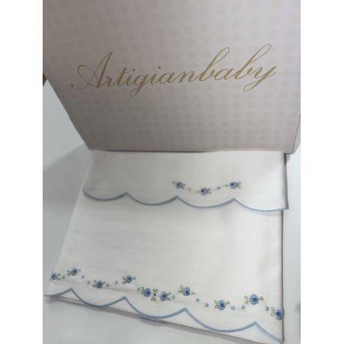 Lenzuola per carrozzina 100% puro cotone. Lenzuola con Fiorelline azzurre interno blue, foglie verde, punto smock azzurro. Realizzata a mano con bordo azzurro. comprende sopra e fodera. Made In Italy
