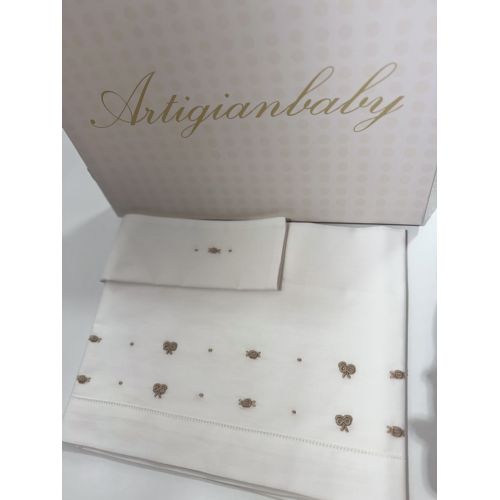 Lenzuolino per carrozzina bianca con fiocchi, punto smock e fiorellini ecrù. Sia per maschio e femmina. Comprende sopra e fodera.