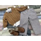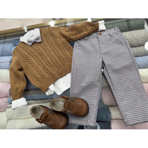 Completo elegante con camicia bianca, maglioncino ruggine e pantalone lunghe a quadri piccole grigio,tortora e papillon a fantasia abbinata ! 5 pezzi