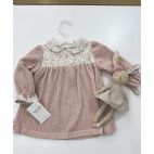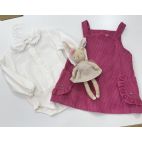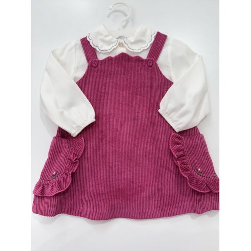 Vestina a salopettina in velluto fucsia con tasche laterali e bodino a camicia con apertura avanti e sotto le gambe con collo ondulato e bodino verde. Made in Italy.