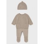 Completino 3 pezzi in caldo cotone. Comprende: maglioncino manica lunga, ghettina e cappellino. Unisex.