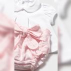 Brand: Mayoral. Completo 3 pezzi: maglia bianca maniche corta di cotone, cardigan rosa in filo di cotone e cuolotta con fiorellini. 100% cotone.