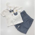 Brand: Melby. Completino con maglia a Polo in piquet con papillon e pantaloncino elasticizzato effetto jeans rigato, molla dietro e regulatore al interno. 100% cotone. Made in Italy.