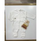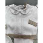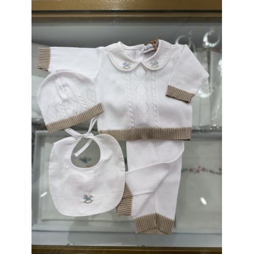 Completino in filo di cotone manica lunga e gamba lunga con colletto ricamato con cavalluccio a dondolo azzurro, cappellino, babbucce e bavetta coordinata. 100% cotone. Made in Italy.