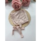 Completino in filo di cotone, maglia con merletto e bella elaborata, culotta, cuffia e scarpini. Colore: Nude.