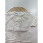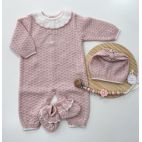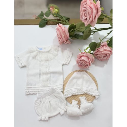 Brand: Mac Ilusión. Completino 4 pezzi. Maglia traforata mezza maniche con merletto, culotta, cuffia e babbucce.