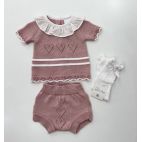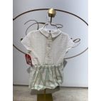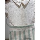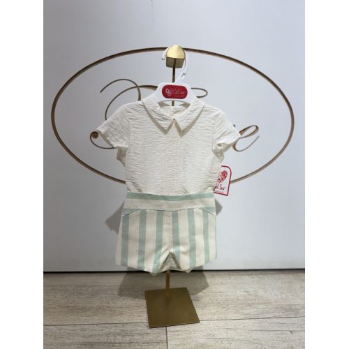 Brand: Del Sur. Tema: Trieste. Completino con camicia beige e pantaloncino a cuolotta con righe ampie verde chiaro e beige, elastico dietro. 100% cotone.